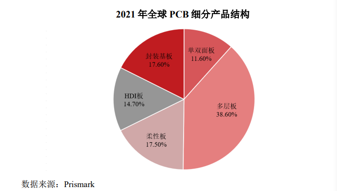 根据不同电子设备使用要求,从层数和技术特点角度PCB可分为单面板、双面板、常规多层板、柔性板、HDI (高密度互联)板、IC封装基板等六个主要细分产品。